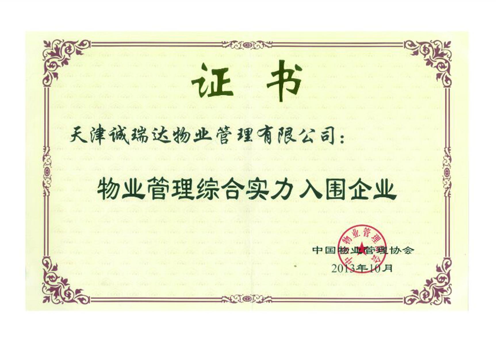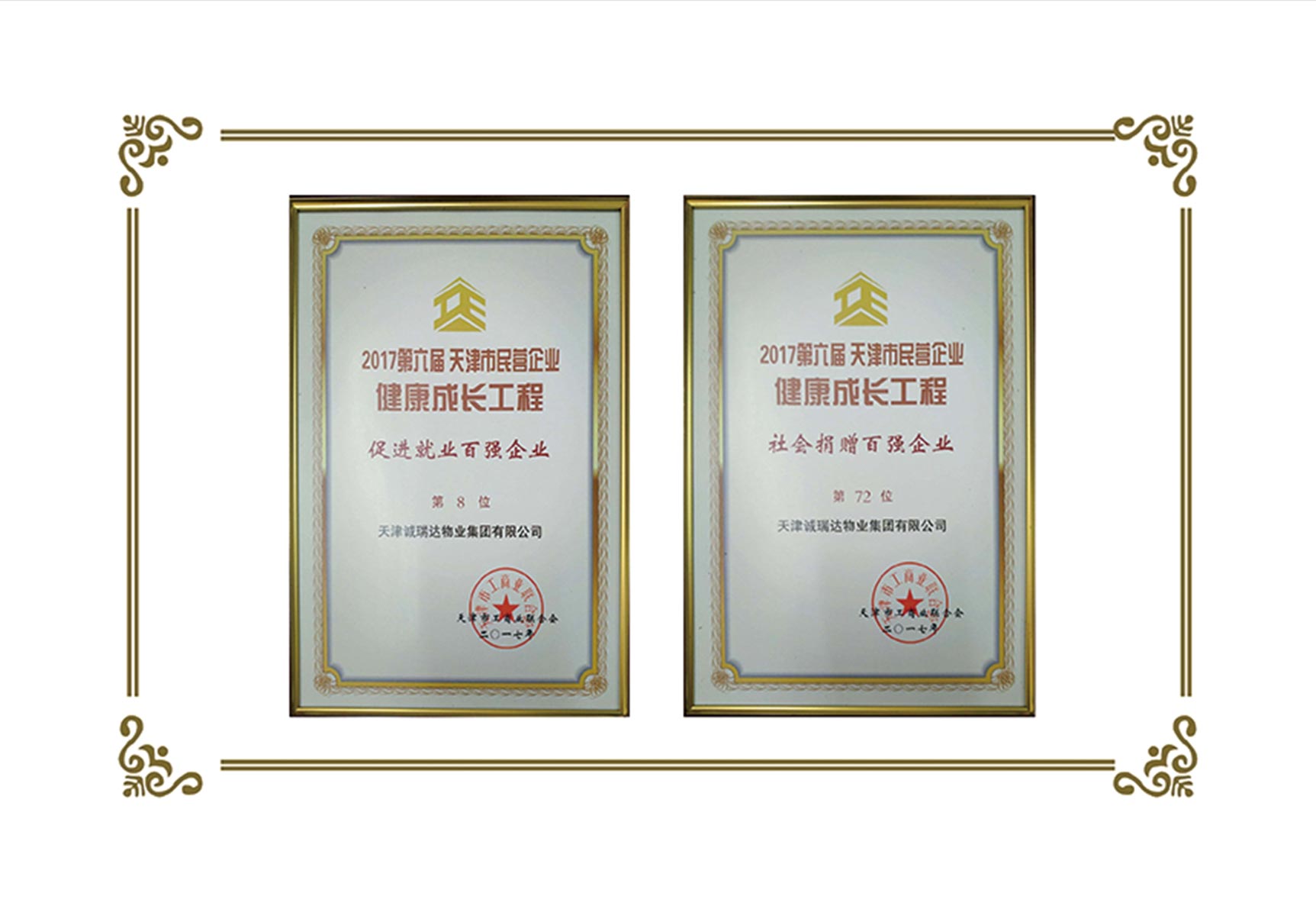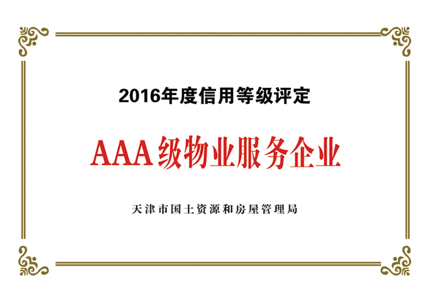 公司被授予天津市物業管理企業優秀項目經理、天津市 AAA 級物業企業誠信經營單位、天津市“兩新組織黨建工作”示范企業、2016 年公司被天津市國土資源和房屋管理局評為首批天津市誠信等級“AAA 級物業服務企業”稱號,2017 年天津市民營企業促進就業及社會捐贈百強企業,并于2017 通過中核工業合格供應商體系認證。