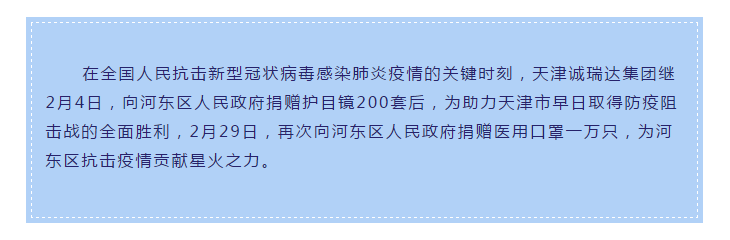 在企業(yè)的日常運行過程中,廣泛參與公益事業(yè)與政策宣傳,以實際行動踐行“努力成為一切社會化服務活動的優(yōu)秀參與者”這一愿景目標。2017年,誠瑞達獲得天津市工商業(yè)聯(lián)合會授予的“天津市民營企業(yè)促進就業(yè)百強企業(yè)”、“天津市民營企業(yè)社會捐贈百強企業(yè)”稱號。